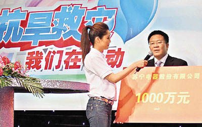 ■蘇寧總裁孫為民(右一)向西南五省市捐贈1,000萬元人民幣,支援災民救災與恢復生產。