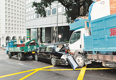 【本報訊】前年6月曾發生旅巴失事意外、釀成1死50傷的港島中環花園道「長命斜」,昨又發生8車連環相撞。一輛運載建築廢料的5.5公噸貨車疑在雨中闖入只准3公噸以下車輛行駛的馬己仙峽道落山,途至花園道美國駐港總領事館對開時疑腳掣失靈,失控撞向正等候轉燈的7輛車,包括兩輛巴士、3輛輕型貨車、一輛私家車及一輛電單車,釀成3人受傷。其中,電單車司機慘被撞至重傷命危,警方事後以涉危駕拘捕肇事貨車司機。期間,附近交通嚴重擠塞近5小時,至晚上7時始恢復正常。