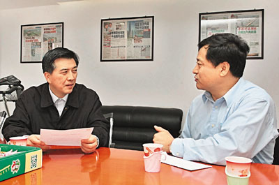 ■福建省政府新聞辦主任朱清(左)與本報副總經理康海峰交談。 本報福建傳真
