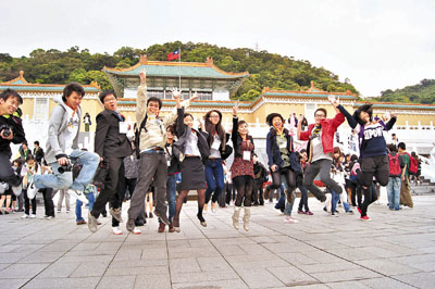 ■港台青年交流促進會在台北故宮外跳躍,開心到飛起!