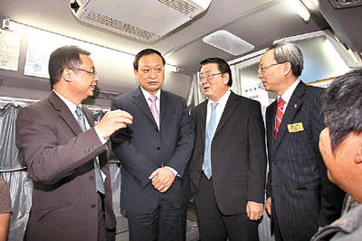 ■國家衛生部副部長王國強(左二)參觀中醫流動車。右二為衛生署署長林秉恩,右一是博愛醫院主席黃帆風。