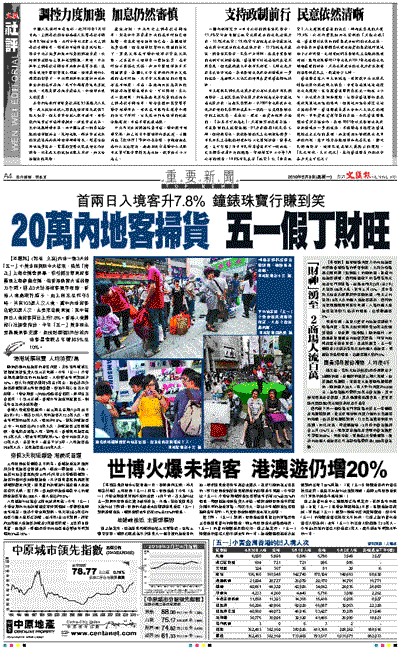 上海世博在勞動節正日開幕,香港旅遊業界預測部分華東旅客會轉到上海、蘇杭一帶旅遊;不過,由於內地各省居民(除上海外)只有3天勞動節假期,旅客均傾向參加短線旅遊,不少廣東省居民都選擇到港澳觀光消費,廣東省的訪港旅行團及個人遊旅客依然火熱。據了解,參加深圳旅遊集散中心的港澳遊旅客有逾1,000人,個人遊佔約70%。