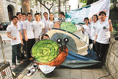 ■10多名年輕人響應「蝸居部落」發起的行動,在立法會大樓外通宵紮營露宿,抗議樓價飆升。本報記者莫雪芝 攝