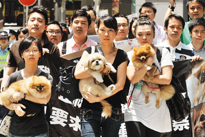 ■愛護動物的遊行人士昨日帶同寵物遊行到灣仔警察總部,促請警方設立「動物警察」專責調查虐殺動物的案件。本報記者劉國權 攝