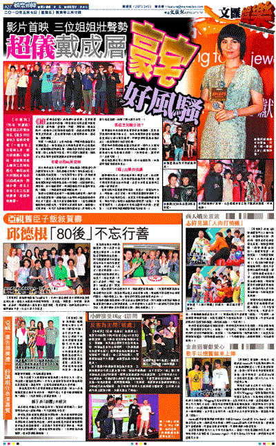 《維多利亞壹號》前晚舉行首映禮,身兼監製及演員的超儀,與導演彭浩翔及戲中演員麥浚龍、盧海鵬、曾國祥、阿肥、周俊偉、連凱出席外,超儀的三位姐姐包括超瓊、超鳳及超蕸更齊現身支持妹妹,其他到場的藝人還有謝霆鋒、鄭希怡、鄭伊健等。