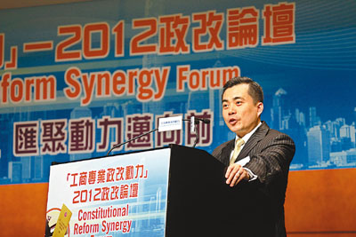 ■黃仁龍昨在「工商專業政改動力」主辦的「2012政改論壇」上發言。本報記者曾慶威 攝