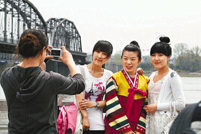 「遼寧濱海大道遊」首發旅遊團的遊客在丹東鴨綠江邊拍照留念。 新華社
