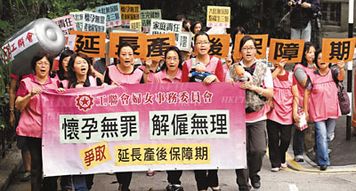 工聯會副會長陳婉嫻、婦女事務委員會主任梁頌恩等多名代表趁昨日為母親節前夕,聯同逾20名婦女由中環皇后像廣場遊行到政府總部,要求政府修訂法例,保障孕婦在工作崗位上的權益。梁頌恩表示,雖然香港的《僱傭條例》和《性別歧視條例》,均有保障在職女性懷孕的條文,但工會近年發現愈來愈多僱主利用法例漏洞,無理解僱懷孕或產後的僱員,而孕婦在懷孕期間更經常受到苛刻待遇,例如被針對或被無理調職,甚至「前4後6」的產假亦被剋扣薪酬。