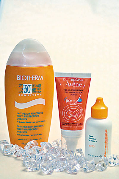 部分防曬產品含有刺激的成分,屬敏感肌膚的人士,選擇時要加倍小心。現時市場上亦不乏專為敏感肌膚而設的防曬產品,例如Biotherm的全新溫泉保濕身體防曬乳,不含香料並可防水,最適合戶外用。Dermalogica是美容院專用的醫學護膚品牌,性質一向溫和可靠。品牌推出了特效抗敏感防曬修護面霜,只選用物理成分天然的植物精華,防曬的同時,可舒緩及鎮靜肌膚。而來自法國的Avene,則推出多個專為敏感肌膚而設計的系列,加上獨特的溫泉精華,可減低敏感度。