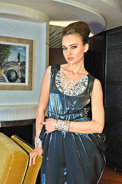 特別的還有大大件couture系列,一反品牌簡約的風格。搶眼的有如胸甲的頸飾,細看下是由多個銅管樂器的造型組合而成,同系列的還有手鐲,全是純銀製造,大膽之餘,不失優雅與簡約之美。