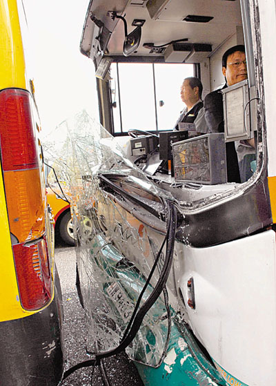 【本報訊】北角及元朗昨先後發生涉及h巴交通意外,昨晨東區走廊1輛電單車失事翻側,尾隨滿載乘客h巴見狀減速,卻被尾隨城巴猛撼車尾,共釀18人受傷。至傍晚,一輛滿載居民的錦繡花園在朗日路與一輛中港密斗貨車攔腰相撞,造成11人受傷,警方懷疑有人衝燈釀意外。