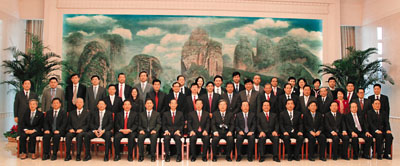 ■天津市委書記張高麗(前排左八)與香港中國商會訪問團合影留念。
