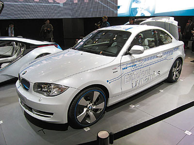 除了Hybrid汽車大出風頭外,BMW全新電動概念車Concept ActiveE同樣惹人矚目。Concept ActiveE原型以1系車身為基礎,並配用上全電動驅動系統,透過電子馬達輸出的最大125kW功率和25.5kgm扭力,令它可以在0-100km/h加速僅在9秒完成,而充電系統則可支援220V(32A)充電,鋁電池完全充電約需4.5小時,並可持續行駛達160km。