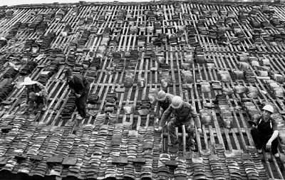 5月20日,福建建陽市水吉鎮坤坊村村民冒雨搶修被冰雹損毀的屋頂。連日來,福建北部地區出現強雷電、雷雨大風、短時強降水、冰雹等強對流天氣,閩北各縣市區不同程度受災,造成2人死亡1人重傷,以及大量農作物、房屋被毀。 中新社