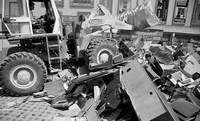 5月20日,河北警方舉行公開集中銷毀電子賭博機現場會,石家莊公安機關對近期開展的嚴打賭博專項行動中收繳的5,483台賭博機進行集中銷毀。圖為推土機碾壓賭博機。 中通社