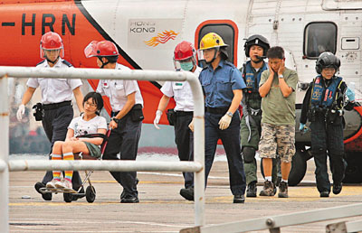 ■在西貢行山懷疑中暑不適的少女由直升機載送灣仔停機坪轉由救護車送院救治。本報記者溫瑞麟 攝