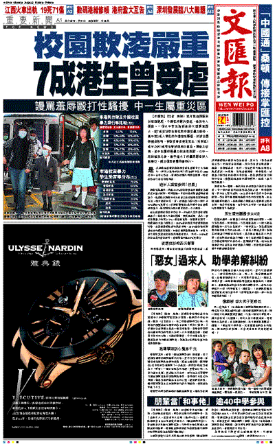 【本報訊】(記者 周婷)近年欺凌問題有如癌細胞般,不斷在校園內蔓延,情況令人憂慮。一項以中學生為對象的大型調查顯示,逾7成受訪學生曾在學校遭受暴力對待,當中近3成人曾在校內遭到性騷擾,如被企圖撫摸或強吻,有些受害者更是男生;另有近1成半及約1成學生曾被威脅及勒索。調查又發現,初中生屬校園暴力的高危族群,以中一級的情況尤甚。數字揭示了校暴問題牽涉人數廣泛,部分個案更屬刑事罪行。