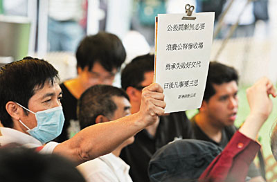 ■昨日的《城市論壇》上,有現場觀眾舉起標語,批評公社連浪費公帑搞補選。 本報記者潘政祁 攝