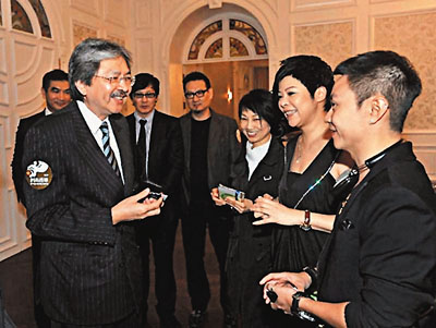 ■曾俊華和參與「時尚香港」表演的香港時裝設計師劉志華、伍均琪和張路路言談甚歡。 財爺網誌圖片