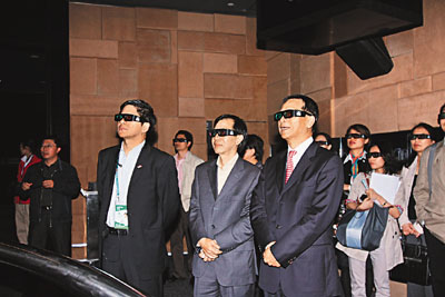 (左至右)陳子敬主任,吳漢榮館長和許漢忠欣賞香港館的三維電影。