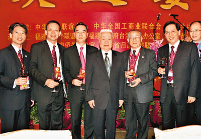 八屆全國人大常委會副委員長王漢斌(左四)在歡迎晚宴上與(左起)盧溫勝、李賢義、林樹哲、林廣兆、吳良好等相見歡。