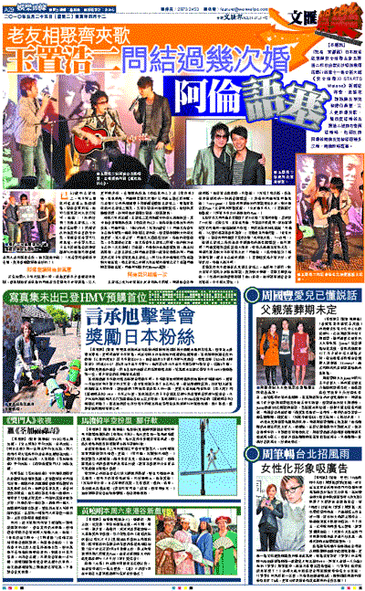 【本報訊】(記者 梁靜儀)日本殿堂級樂隊安全地帶主音玉置浩二昨日出席尖沙咀洲際酒店舉行的第十一張全新大碟《安全地帶XI STARTS Matane》新碟發佈會,並請來譚詠麟及李克勤擔任嘉賓,三人更即場夾歌,曾四度結婚的玉置浩二被問可會再結婚時,他卻反問同場的阿倫及克勤結過幾多次婚,阿倫即時語塞。