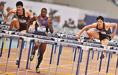 ■劉翔(右起)、奧利弗及史冬鵬並駕齊驅。法新社