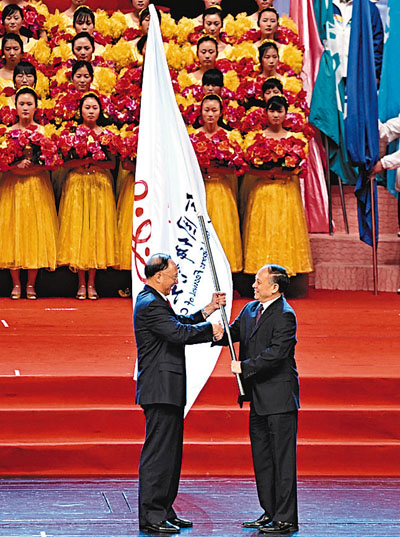 ■國家體育總局局長劉鵬(左)向第五屆全國體育大會舉辦城市代表、重慶市副市長謝小軍移交全國體育大會會旗。 新華社