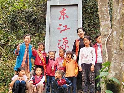 ■吳方笑薇(左)與東江源村的孩子們在源頭合影