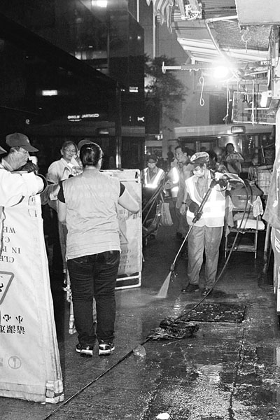 ■食環署晚上到畢打里洗街。