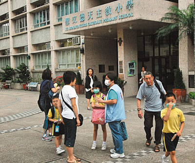 ■黃大仙聖文德天主教小學累積有24名學生有手足口病徵,因毋須停課,學生多戴口罩上學。 本報記者彭子文 攝