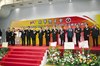 【本報訊】(記者 沈清麗)南華體育會昨晚舉行百周年慶祝酒會、2010-2011年度第90屆職員就職暨徵求會員出發典禮。行政長官曾蔭權蒞臨酒會,並在會長余潤興、主席許晉奎陪同下,主持百周年時間囊封存儀式及祝酒儀式。民政事務局局長曾德成出席就職禮擔任主禮嘉賓,頒發徵求會員領隊紀念品。