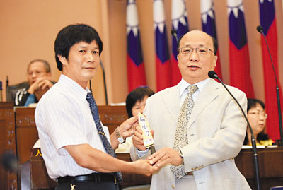 因官警出現在角頭槍擊案現場而遭受砲轟的台中市長胡志強(右),4日在議會備詢時,議員劉士州(左)送上1把「胡小刀」,盼胡志強能切割警方與黑道關係。 中央社