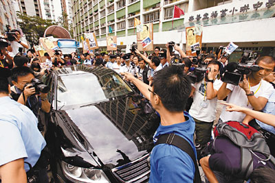 【本報訊】(記者 鄭治祖)激進示威者狙擊落區官員的歪風越吹越烈,黃仁龍昨日到學校與同學交流對政改方案的意見時,被民主黨及社民連成員包圍辱罵,又高呼「可恥」等口號,其中有人並試圖以身體阻擋黃仁龍的座駕前進,最終要警方手拉手組成「人鏈」護送黃仁龍離開現場。黃仁龍強調,理性溝通並不可恥,大聲謾罵才違反民主發展,香港要達到普選的理想,民主軟件的準備同樣刻不容緩,「水清才石出」,必須積極栽培真正的民主精神和涵養,並希望社會各界可以不同意別人意見,但必須堅持尊重別人發言的權利與自由。