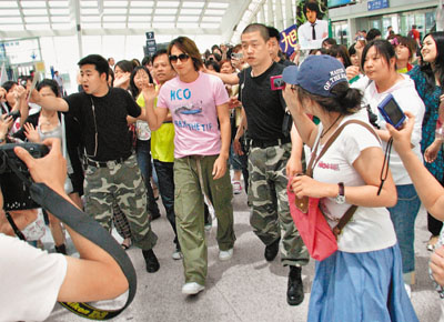 昨天中午大約十二點左右,穿著粉紅色T恤、綠色牛仔褲的言承旭走出北京首都機場T3出境大廳,數百位粉絲無不尖叫起言承旭的英文名字Jerry。他顯然心情很好,一路上微笑接受影迷拍照,而且為了擔心他們危險,他特地走得很慢,滿足影迷想見他的慾望。已經有五年未到過北京。言承旭昨天滿臉微笑,但仍如平常害羞寡言。甚至還有接機的旅客見偶像降臨,忘了要接親人,一路追著言承旭到停車場。言承旭臨上車前,回頭向粉絲做了一個打電話的手勢,粉絲們又興奮尖叫。