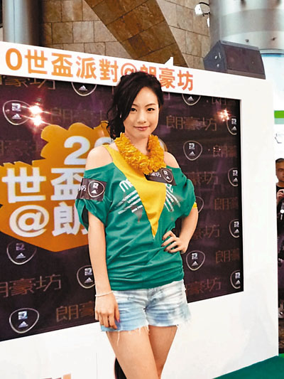 昨日鄧麗欣聯同一班本地球星包括陳肇麒、陳偉豪及郭建邦等,到旺角為一個於商場舉行的世界盃活動主持揭幕禮,他們又分別穿上巨型卡通版戰靴試玩「衝力射球」,但「嬌滴滴」的鄧麗欣有姿勢卻無實際。鄧麗欣表示自小已看世界盃,但就未試過在現場欣賞賽事,一直都是捧阿根廷。問到其緋聞男友方力申可喜歡睇波?她說:「實鍾意啦,男仔都鍾意睇。」