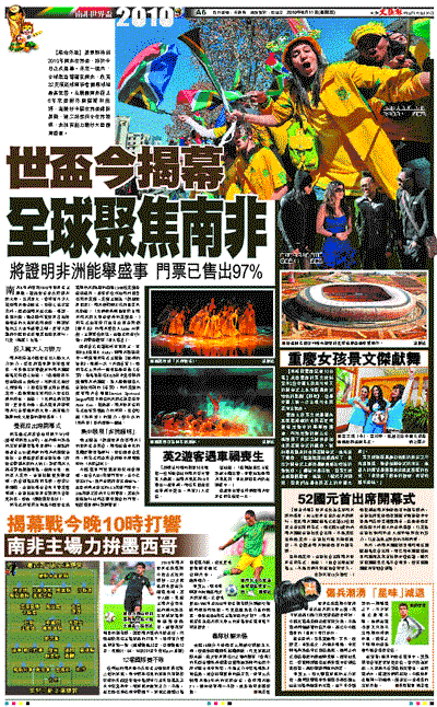 【綜合外電】萬眾期待的2010年南非世界盃,將於今日正式揭幕。未來一個月,全球焦點都落在南非,欣賞32支頂級球隊爭奪國際球壇最高榮譽。主辦國南非過去6年來面對外間質疑和批評,為辦好今屆世界盃排除萬難,這次將要向全世界證明,非洲有能力辦好大型體育盛事。