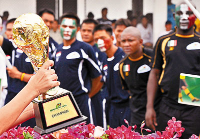 ■曼谷一監獄亦響應世盃效應,昨日舉行「鐵窗內的世盃」比賽,不同囚犯代表不同世盃代表隊進行足球賽。 法新社