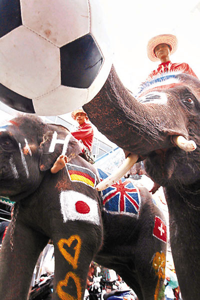 ■南非國內近日出動畫上世盃參與球隊國旗的大象,以象鼻吸著足球於市內漫遊宣傳世盃。 路透社