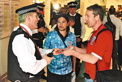 警察在倫敦希斯羅機場檢查英格蘭球迷的證件,阻止足球流氓飛赴南非世盃賽搗亂。 美聯社