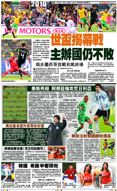 【本報訊】世界盃決賽周賽事昨晚歷史性首度在非洲大陸上演,約翰內斯堡足球城球場座無虛席,東道主南非在8.5萬名球迷打氣下,結果跟賽前稍被看好的墨西哥踢成1:1,延續主辦國首戰不敗的傳統。雙方暫於A組各得1分,餘下兩場對出線就更為關鍵。