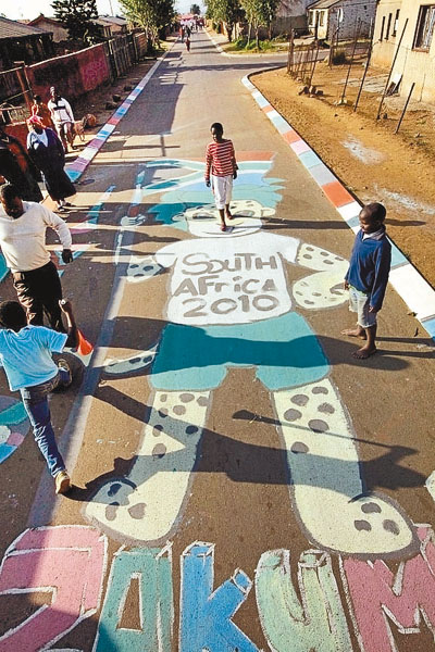 ■南非世界盃開鑼,當地街頭大賽氣氛十足,市民更在馬路上畫公仔為世盃打氣。 法新社