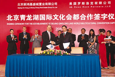 中國(北京青龍湖)國際文化會都有限公司,由北京新鴻基盛城置業集團有限公司,與美國洛克菲勒家族成員企業羅斯洛克有限公司組建的合資公司。羅斯洛克有限公司代表向本報記者透露,洛克菲勒家族之所以和中國企業合作,是因為北京市強調人文北京、科技北京,而這些恰恰是他們所看重的。
