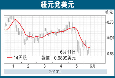 另一方面,歐元兌美元匯價從上周的1.18水平持續向上反彈至1.21水平後,這除了是顯示投資者對於歐元區的主權債務危機已有所緩和之外,該情況亦是引致投資者的避險情緒略為下降的原因之一,故此在歐美股市反彈的影響下,連帶商品貨幣的升幅亦稍為有所擴大。由於日本首相菅直人對日本公共債務的膨脹發出警告後,日圓匯價將可能會遇到進一步的下調壓力,因此不排除與日圓相關的利差交易活動將會有所增加,該情況亦將有助紐元兌日圓交叉匯價的表現,所以在受到紐元兌日圓交叉盤轉強的帶動下,預料紐元兌美元將反覆走高至69.90美仙水平。