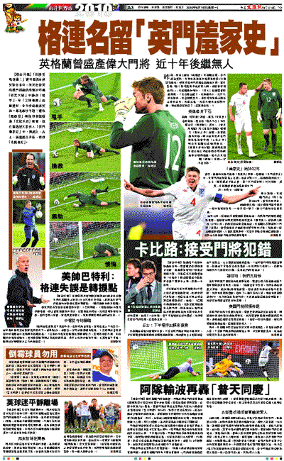 昨晨,世盃C組由「風頭躉」英格蘭出賽,豈料成為笑柄。英軍先藉隊長中場謝拉特於4分鐘建功領先,但完半場前門將羅拔格連送大禮,接丹普西「軟」射時竟甩手送皮球入網,最終被美國迫和1:1,英格蘭痛失兩分。「罪人」格連賽後知衰認錯,「我已經30歲了,我是個男人。我可以承受挫折,我會繼續努力,並要時刻準備著聽候主帥的召喚,再度出場。我也不想再去辯解什麼,現在應該忘掉它了,這就是生活。」