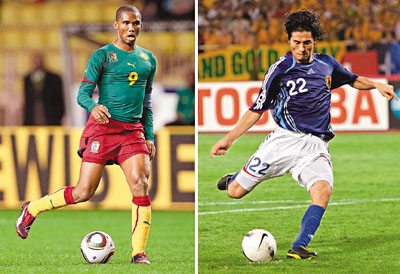 ■喀麥隆前鋒伊度奧(左)近態佳,將會給日本中澤佑二(右)的防線帶來很大的壓力。 法新社
