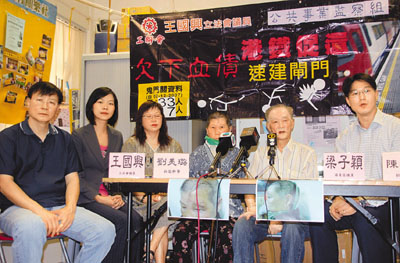 ■王國興(左一)批評港鐵賺大錢,卻沒有做足乘客安全措施。右三為頭部曾撞向列車受傷的黃女士。本報記者聶曉輝 攝