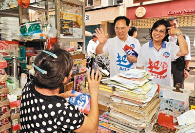 ■曾蔭權與太太昨先後到中環、灣仔及筲箕灣派單張宣傳政改方案,爭取市民的支持。