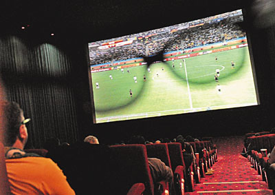 ■在墨爾本大戲院,球迷利用3D觀看南非世界盃澳洲對德國的比賽。法新社