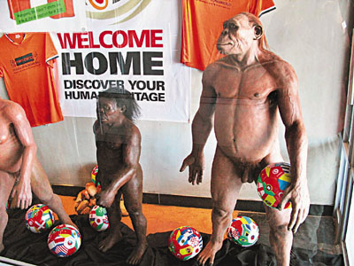 ■在南非默爾德斯德里夫市的一個人類進化博物館內,印有世界盃參賽國國旗的足球與原始人一起成為展品。 法新社